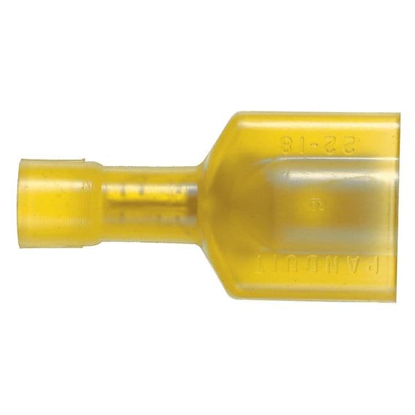 Wire Disconnect, Contact Finish Nickel, Contact Material Copper, Disconnect Style Quick Disconnect, Insulation Color Yellow, Insulation Coverage Full Coverage, Insulation Material Nylon, Maximum Temperature 221 Degrees F, Minimum Wire Size 12 AWG, Maximum Wire Size 10 AWG, Maximum Voltage 600 V, Tab Thickness 0.032 in, Tab Width 0.25 in, Terminal Type Tab, Termination Style Crimp, UL 94 Flammability Rating HB, V-2, RoHS Compliant Yes, Seam Style Butted