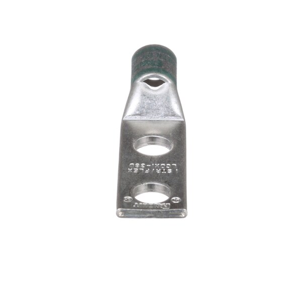 Two-hole, flex lug, #1 AWG wire, 3/8 stud hole, 1 hole spacing.