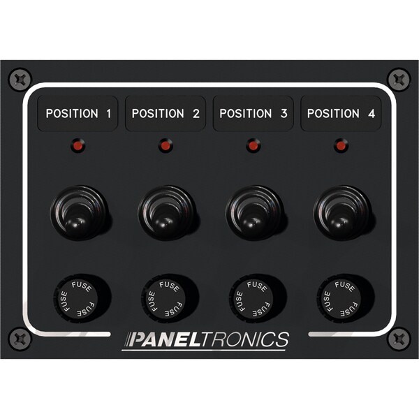 DC 4-Position Toggle Switch Panel with LED's. Each switch has a silicone rubber boot to protect from water and dust. Splash proof fuse holders with 10 AMP fuses provide overcurrent protection. Includes LED's, Width: 5-1/4", Height: 3-3/4", Depth: 3", Current: DC.