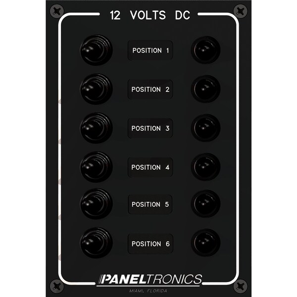 DC 6-Position Vertical Toggle Switch Panel. DC 6-Position Spalsh Proof Vertical Circuit Breaker Toggle Switch Panel, Width: 4-5/8", Height: 6-3/8", Depth: 3", Current: DC.