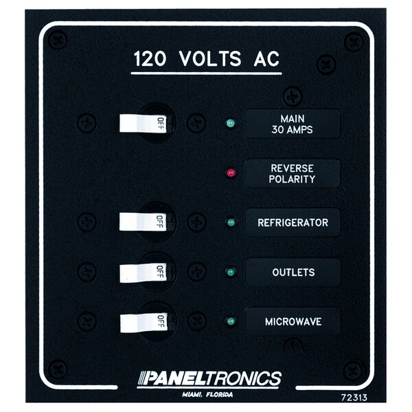 AC 3 Position Circuit Breaker Panel with 30 AMP Main and indicator lights (3-15A's),Current: AC, Width: 5 1/2, Height: 6, Depth: 3 1/2.