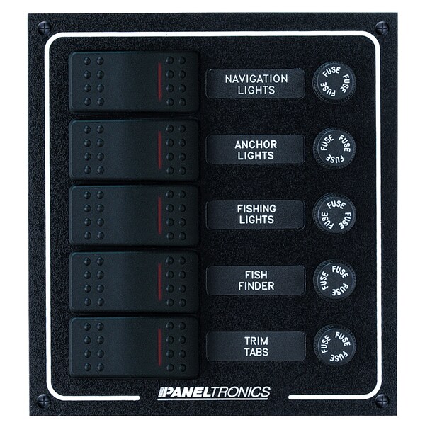 Switches have a built-in red indicator light and are designed for use in exposed marine applications. Splash proof fuseholders with 10 Amp fuses provide overcurrent protection., Current: DC, Width: 5 1/2, Height: 6, Depth: 3.
