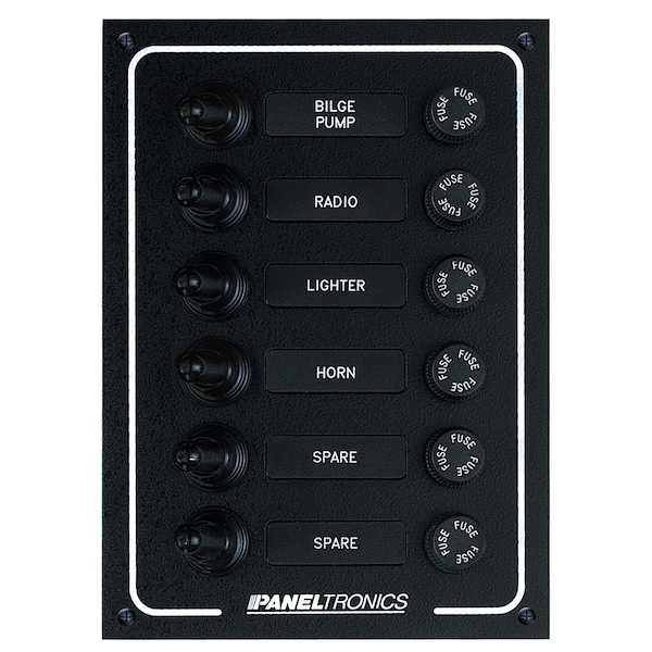Each switch has a silicone rubber boot to protect from water and dust. Splash proof fuseholders with 10 Amp fuses provide overcurrent protection,Current: DC, Width: 4 5/8, Height: 6 3/8, Depth: 3.