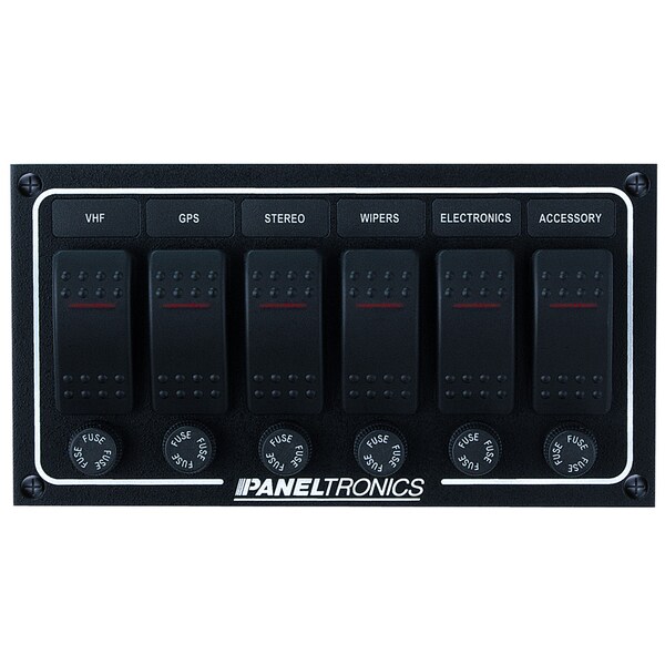Switches have a built-in red indicator light and are designed for use in exposed marine applications. Splash proof fuseholders with 10 Amp fuses provide overcurrent protection., Current: DC, Width: 7 1/2, Height: 4, Depth: 3.