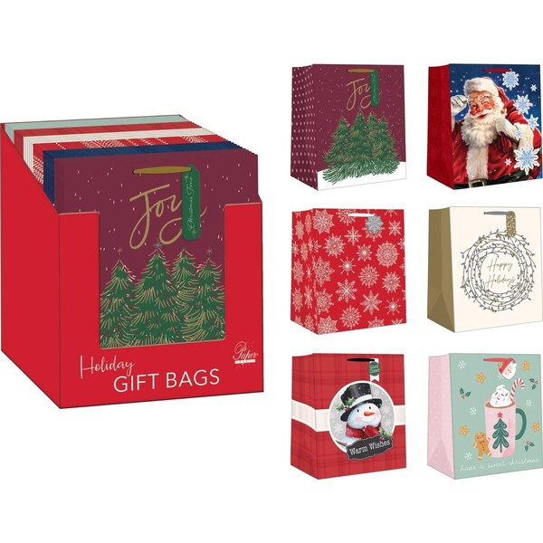 Decorate this holiday season with these wide large-size gift bags. Choose from an assortment of styles all featuring a gift tag.