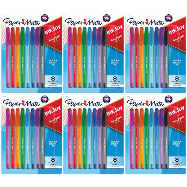 Spread joy with vivid color! Paper Mate InkJoy 100ST ballpoint pens have a smooth, fast-starting writing system that spreads ink easily so writing's never a drag. Even work or school is fun when you can choose from a rainbow of eight brilliant colors and enjoy ink that flows as freely as your thoughts. Brighten up every page and make writing more exciting with Paper Mate InkJoy ballpoint pens. Each pack includes 8 pens. Sold as 6 packs for a total of 48 pens.