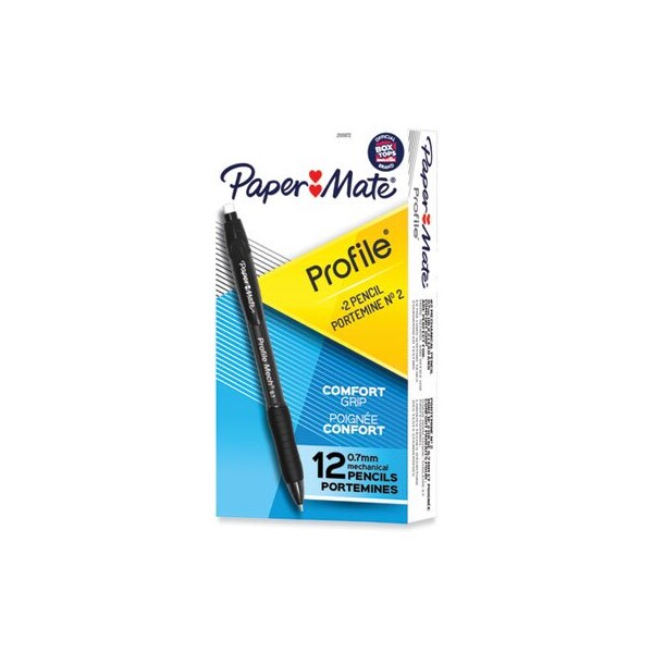 Paper Mate Profile Mech Mechanical Pencils combine the look and feel of a pen with the performance and versatility of a pencil, so you stay sharp during any writing task. They feature a comfortable grip that helps you keep writing until the job is done. These pencils contain 0.7 mm HB #2 pencil lead, making them great for school, home, or the office and perfect for standardized testing. Retractable Yes/No: Yes; Eraser Yes/No: Yes; Graphite Colors: Black; Color Family: Black.