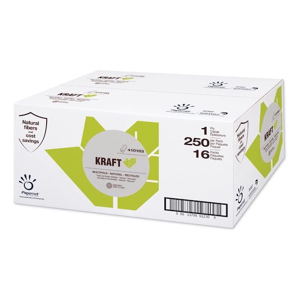 Kraft Tech Multifold Paper Towels, 1 Ply, 250 Sheets, 193 ft, Brown, 16 PK