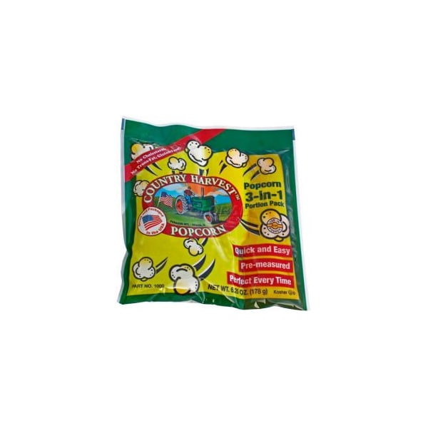 Paragon 1000 country harvest tri-pack for 4oz poppers, 24 portion packs using these pre-measure packs of corn, coconut oil, and seasoning cuts waste and saves money