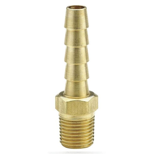 Barbed Fitting Adapter, Fitting Side A Connection Type Barbed, Fitting Side B Connection Type MNPT, Fitting Side B Pipe Size 1/4 in, Fitting Side A Tube Inner Diameter 1/4 in, Barb Style Standard, Fitting Material Brass, Material Grade C27450, Overall Length 1 23/32 in, Specific Fitting Shape Straight Adapter, Application Air, Maximum Operating Pressure 150 psi, Maximum Operating Temperature 160 Degrees F, Standards NSF, Hex Size 9/16 in, Minimum Operating Temperature 40 Degrees F