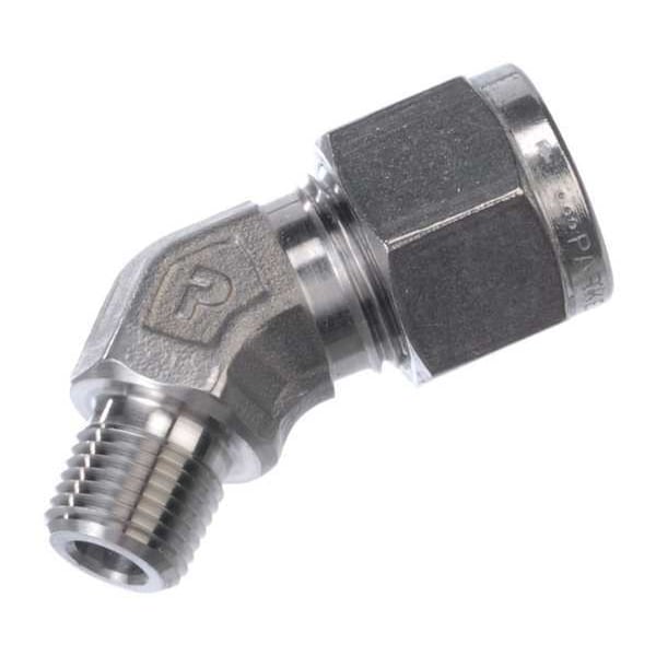Compression Fitting Elbow, Application Compressed Natural Gas, Fuels, Gases, Hydrogen, Liquids, Oils, Petroleum Oil, Steam, Fitting Side A Connection Type Compression, Fitting Side B Connection Type MNPT, Fitting Material Stainless Steel, Fitting Side A Tube Outer Diameter 3/8 in, Material Grade 316, Maximum Operating Pressure 6,600 psi, Maximum Operating Temperature 649 Degrees C, Specific Fitting Shape 45 Degrees Elbow Adapter, Fitting Side B Pipe Size 1/8 in