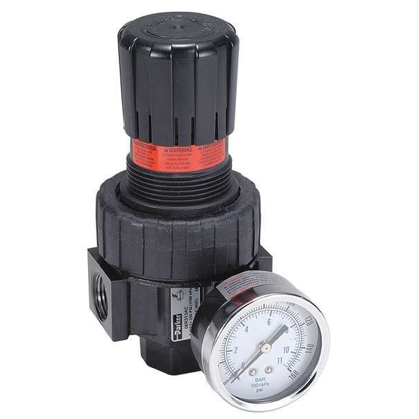 Compressed Air Regulator, Air Inlet Size 3/8 in, Air Inlet Type NPT, Maximum Flow Rate 60 cfm, Maximum Operating Pressure 125 psi, Maximum Operating Temperature 175 Degrees F, Pressure Gauge Included Yes, Adjustment Mechanism Knob, Overall Width 2 3/4 in, Adjustment Location Top, System Location Air Line, Series 06R, Adjustment Mechanism Material Steel, Air Inlet Gender Female, Air Outlet Gender Female, Air Outlet Size 3/8 in, Air Outlet Type NPT, Body Material Zinc, For Fluid Type Air
