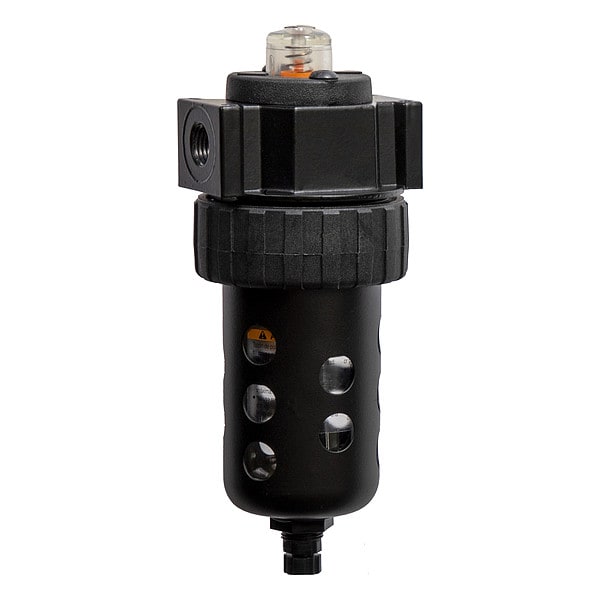 Coalescing filter, Filter Type Particulate, Air Inlet Size 1/4 in, Air Inlet Type NPT, Maximum Flow Rate 95 scfm, Maximum Operating Pressure 250 psig, Maximum Operating Temperature 175 Degrees F, Overall Width 3 13/16 in, Overall Height 7 1/8 in, Drain Included Yes, Filter Bowl Material Polycarbonate, Drain Type Automatic, Series Series 11F, Differential Pressure Indicator Included Yes, Body Material Zinc, Filter Bowl Capacity 4.4 oz, Filter Bowl Guard Included Yes