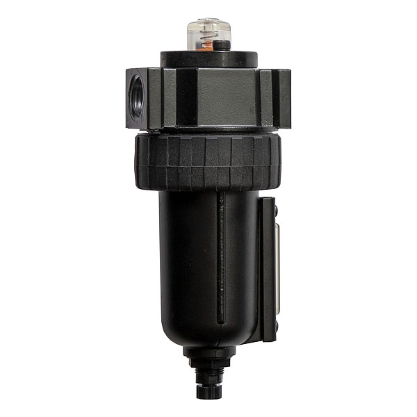Coalescing filter, Filter Type Particulate, Air Inlet Size 1/2 in, Air Inlet Type NPT, Maximum Flow Rate 95 scfm, Maximum Operating Pressure 250 psig, Maximum Operating Temperature 175 Degrees F, Overall Width 3 13/16 in, Overall Height 7 1/8 in, Drain Included Yes, Filter Bowl Material Polycarbonate, Drain Type Automatic, Series Series 11F, Differential Pressure Indicator Included Yes, Body Material Zinc, Filter Bowl Capacity 4.4 oz, Filter Bowl Guard Included Yes