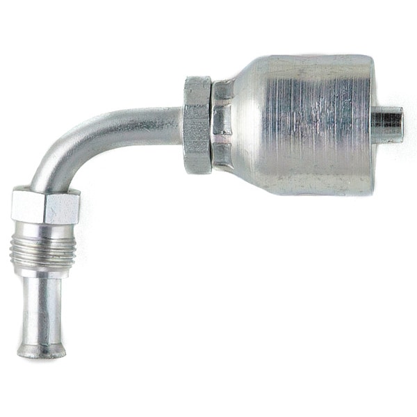 Hydraulic Crimp Fitting, For Hose Dash Size -6, For Use With Hose Series 787TC; 787ST; 797TC; 797ST, For Hose I.D. 3/8 in, Thread Size 5/8 In.-18, Fitting Shape 90 Degrees Elbow, Swivel, Vacuum Rating Not Rated, 2,250 psi, Thread Type Inverted Flare, Hose Fitting A Gender Male, Hose Fitting B Gender Genderless, Hose Fitting A Size 5/8 in, Hose Fitting B Size 3/8 in, Hose Fitting A Connection Type Inverted Flare, Hose Fitting B Connection Type Crimp, Fitting Material Steel x Steel, Reusable No