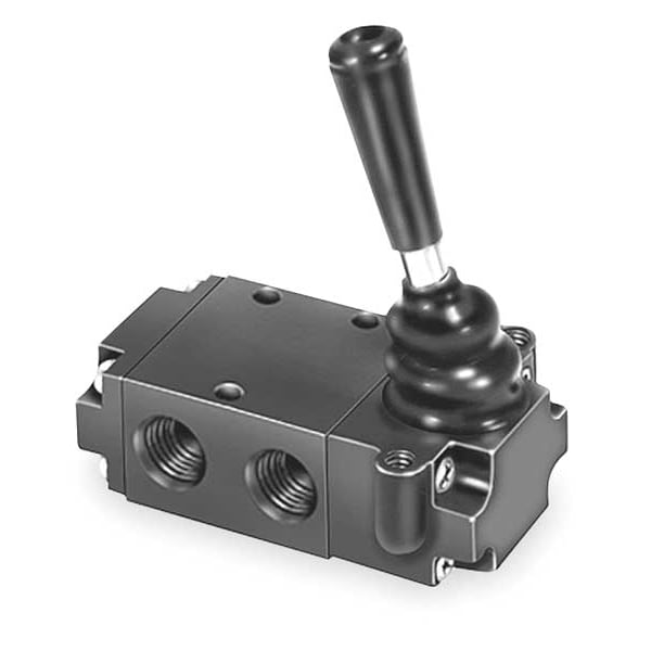 Manual Air Control Valve, Valve Ways and Positions 3-Way/2-Position, Valve Port Size 1/4 in, Connection NPT, Valve Actuator / Return Lever / Spring, Max. CFM - Valves 0.83 cfm, Valve Max. Pressure Rating 150 psi, Valve Temp. Range 32 Degrees to 175 Degrees F, Center Position Not Applicable, Coefficient of Volume 0.8, Body Material Aluminum, Overall Length 3 7/8 in, Overall Height 4 1/16 in, Overall Width 1 1/16 in, Series DirectAir 4, Manual Air Control Valve
