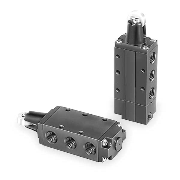 Manual Air Control Valve, Valve Ways and Positions 4-Way/2-Position, Valve Port Size 1/4 in, Connection NPT, Valve Actuator / Return Roller / Spring, Max. CFM - Valves 0.83 cfm, Valve Max. Pressure Rating 150 psi, Valve Temp. Range 32 Degrees to 175 Degrees F, Center Position Not Applicable, Coefficient of Volume 0.8, Body Material Aluminum, Overall Length 5 1/8 in, Overall Height 1 5/8 in, Overall Width 1 1/16 in, Series DirectAir 4, Manual Air Control Valve