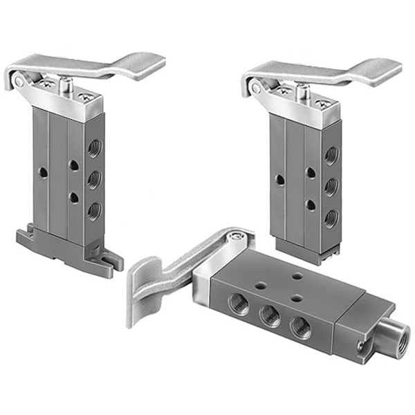 Manual Air Control Valve, Valve Ways and Positions 4-Way/2-Position, Valve Port Size 1/8 in, Connection NPT, Valve Actuator / Return Lever / Spring, Max. CFM - Valves 0.2 cfm, Valve Max. Pressure Rating 150 psi, Valve Temp. Range 32 Degrees to 175 Degrees F, Center Position Not Applicable, Coefficient of Volume 0.2, Body Material Aluminum, Overall Length 4 7/8 in, Overall Height 3 3/8 in, Overall Width 5/8 in, Series DirectAir 2, Manual Air Control Valve