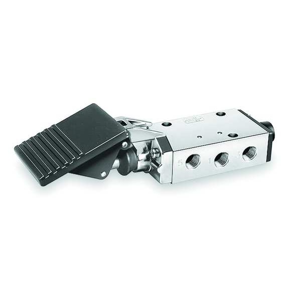 Manual Air Control Valve, Valve Ways and Positions 4-Way/2-Position, Valve Port Size 3/8 in, Connection NPT, Valve Actuator / Return Foot Pedal / Spring, Max. CFM - Valves 2.9 cfm, Valve Max. Pressure Rating 150 psi, Valve Temp. Range 0 Degrees to 140 Degrees F, Center Position Not Applicable, Coefficient of Volume 2.9, Body Material Aluminum, Overall Length 8 5/8 in, Overall Height 2 1/8 in, Overall Width 2 1/8 in, Series 42, Manual Air Control Valve