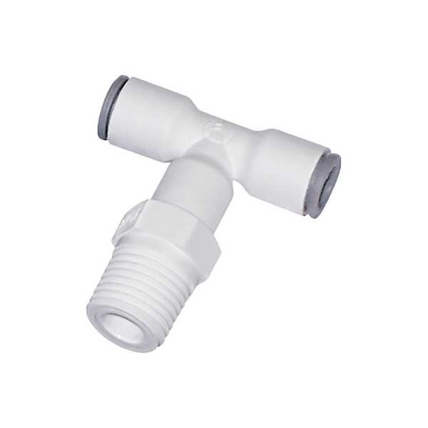 Push-Fit Tee Fitting, Application Beverages, Carbon Dioxide, Potable Water, Color White, Fitting Side A Connection Type Push-to-Connect, Fitting Side B Connection Type Push-to-Connect, Fitting Side C Connection Type MBSPT, Material Grade Not Applicable, Includes Pre-Applied Thread Sealant Pre-Applied Thread Sealant Not Included, Fitting Side C Pipe Size 3/8 mm, Fitting Side B Tube Outer Diameter 8 mm, Fitting Material Nylon, Maximum Operating Pressure 230 psi