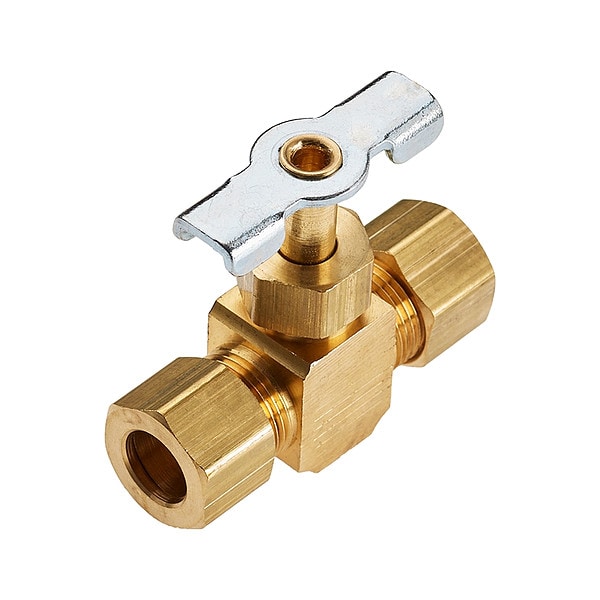 Needle Valve, Straight, Body Material Brass, Tube Size 1/4 in, Compression to Compression Connection, Stem Type Brass, Seal Material Neoprene, Handle Material Zinc-Plated Steel, Temp. Rating -45 Degrees to 250 Degrees F, Max. Height 1 1/2 in, Length 1 13/32 in, Standards ISO 14001, ISO 9001, RoHS