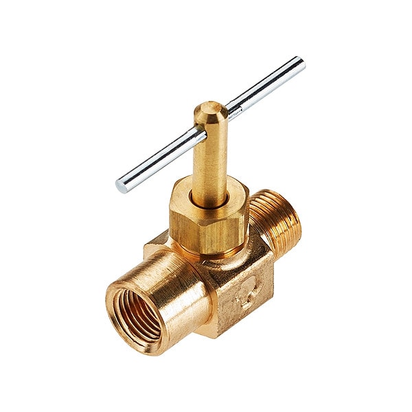 Needle Valve, Straight, Body Material Brass, Pipe Size 1/8 in, FNPT x MNPT Connection, Stem Type Brass, Seal Material Neoprene, Handle Material Zinc-Plated Steel, Temp. Rating -45 Degrees to 250 Degrees F, Max. Height 1 1/2 in, Length 1 23/64 in, Standards ISO 14001, ISO 9001, RoHS