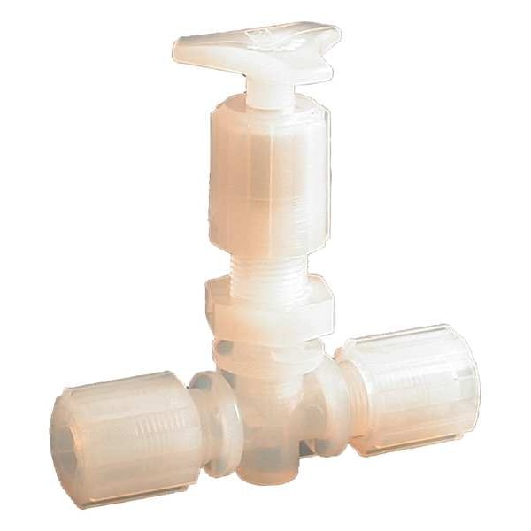 Needle Valve, Straight, Body Material PFA, Tube Size 1/4 in, Compression Connection, Stem Type PFA, Seal Material PFA, Handle Material PFA, Max. Pressure 100 psi, Temp. Rating Ambient: 0 Degrees to 212 Degrees F; Fluid: 0 Degrees to 266 Degrees F, Max. Flow 3.6 gpm, Max. Height 3 53/64 in, Length 3 5/16 in, Standards ANSI, ISA S75.02