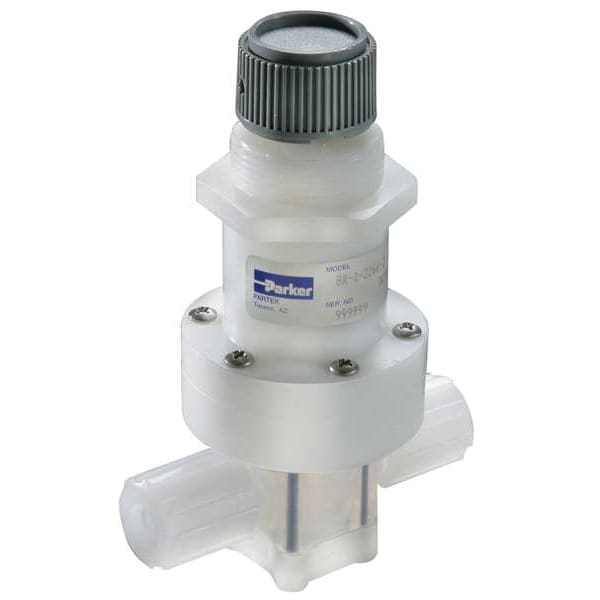 Pressure Regulator, Series PR-1, Body Material Modified PTFE, Inlet Size 1/4 in, Outlet Size 1/4 in, Length 2 3/8 in, Height 5 5/8 in, Application Ultra-Pure Water and Aggressive Chemicals, Connection Type Parflare, Pressure Adjustment Range 0 to 30 psi, Seal Material PTFE, Max. Temp. 150 Degrees F, Pipe Size 1/4 in, Max. Pressure 120 psi