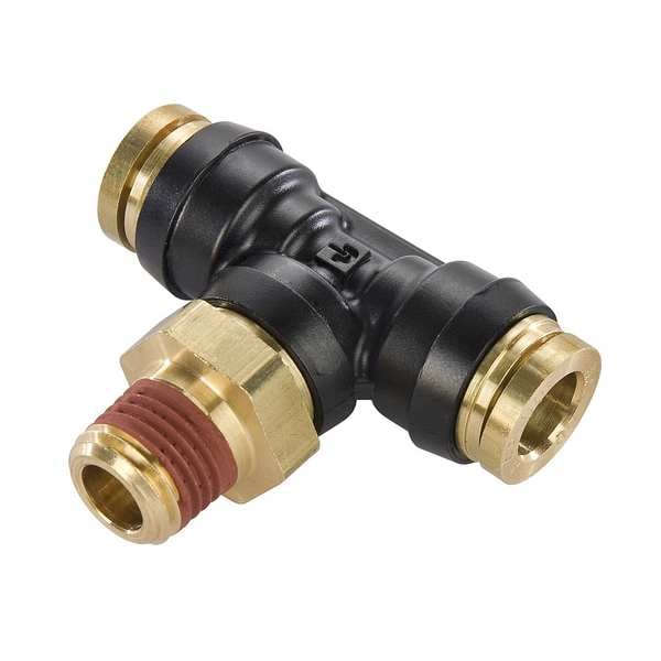 Composite DOT Push-to-Connect Fitting, Application Air, Color Black, Fitting Side A Connection Type Push-to-Connect, Fitting Side B Connection Type Push-to-Connect, Fitting Side C Connection Type MNPT, Includes Pre-Applied Thread Sealant Yes, Fitting Side C Pipe Size 1/4 in, Fitting Side B Tube Outer Diameter 3/8 in, Fitting Material Composite, Maximum Operating Pressure 250 psi, Maximum Operating Temperature 200 Degrees F, Overall Length 2 1/32 in, Specific Fitting Shape Tee