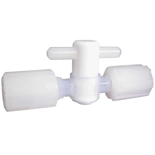 Stopcock, 2-Way, Body Material PFA, Connection Type Compression, Pipe Size 1/8 in, Max. Pressure 60 psi, Temp. Range 0 Degrees -266 Degrees F, Handle Type Tee, Seal Material PTFE, Overall Height 1 3/8 in, Overall Length 2.56 in
