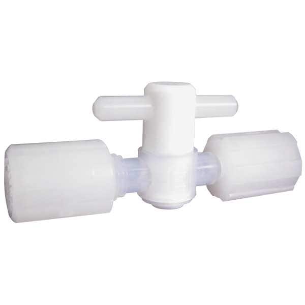 Stopcock, 2-Way, Body Material PFA, Connection Type Flare, Pipe Size 1/4 in, Max. Pressure 60 psi, Temp. Range 0 Degrees -266 Degrees F, Coefficient of Volume 0.44, Handle Type Tee, Seal Material PTFE, Overall Height 1 3/8 in, Overall Length 3.38 in