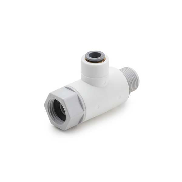 Manual Three-Way Ball Valve, Body Material Polypropylene, Inlet Connection Size 1/4 in, Inlet Connection Type Push, Outlet Connection Size 1/4 in, Outlet Connection Type NPT, Maximum Operating Pressure 150 psi, Minimum Operating Temperature 35 Degrees F, Maximum Operating Temperature 200 Degrees F, Standards FDA Compliant, NSF/ANSI 51, NSF/ANSI 61