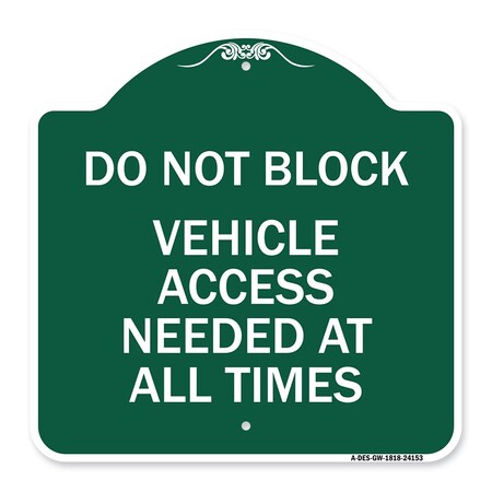 Do Not Block Vehicle Access Needed All Times, Green & White Aluminum Sign, 18" x 18", GW-1818-24153
