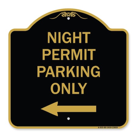 Night Permit Parking W/ Left Arrow, Black & Gold Aluminum Sign, 18" x 18", BG-1818-23859