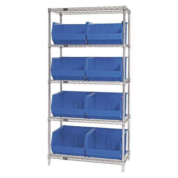 Wire Shelving Unit with (8) Bins, 5 Shelf, 36" x 18" x 74", Blue, 1/Each