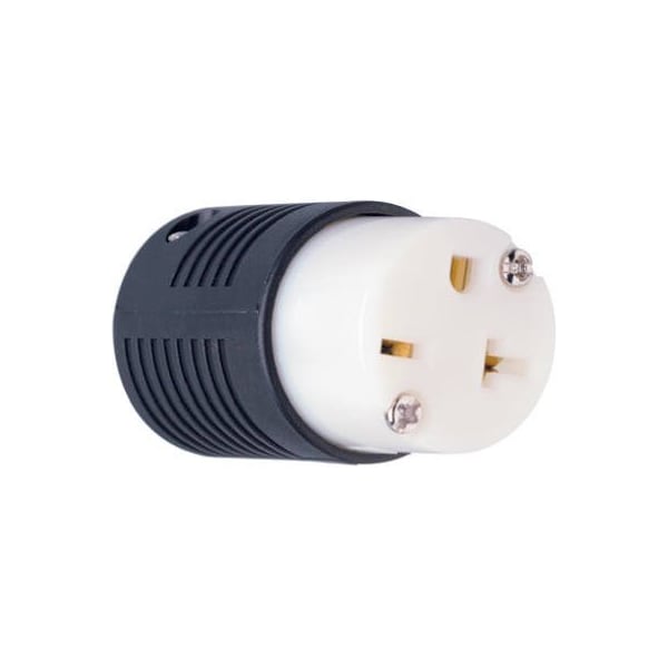 20A, 250V, Black White, 2 Pole, 3 Wire Grounding, Heavy Duty Straight Blade Connector, NEMA 620r, UL, Federal Specification, CSA, Extra Hard Use, Ready To Wire See Through Terminal Chamber For Clear View Of Wire Connections, Chemical Impact Resistant Nylon Housing, Matching Plug True Value 602174, Box