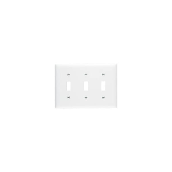 White, 3 Gang, 3 Toggle Openings, Nylon Wall Plate, UL, CSA, 3/16in Taller & Wider That Standard Size Wall Plate For Better Coverage, Molded Of Rugged Practically Indestructible Self Extinguishing Nylon, 6.563in x 4.6875in, Cello Wrap.