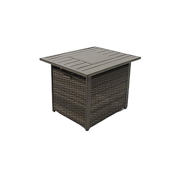 Four Seasons, Catania aluminum slat top firepit Aluminum slatted table 15,000 gas firepit Allweather woven shroud hides LP tank not included Glass beads and burner cover included Matching Inside rocker deep seating chair sold separately Assembled dimensions 3378 x 2717 x 2472