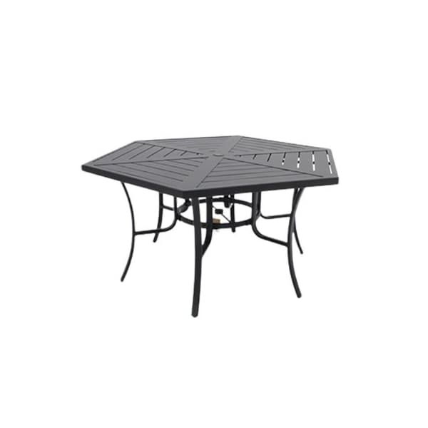 Four Seasons, Naples 60 in hexagonal dining table Unique slatted top design Dark powder coated steel frames Matching swivel rocker, umbrella and umbrella base sold separately Assembled dimensions 6161 x 5335 x 2874
