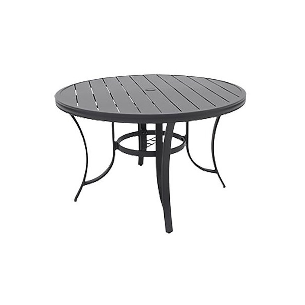 Four Seasons, Palermo 48 round slat top dining table Rustfree aluminum powder coated frames with a neutral light grey finish Matching cspring chair, swivel rocker, 40 square table, 40x68 dining table,market umbrella, umbrella base, and 3 piece Bistro set sold separately Assembled dimensions 4768 x 4768 x 2854