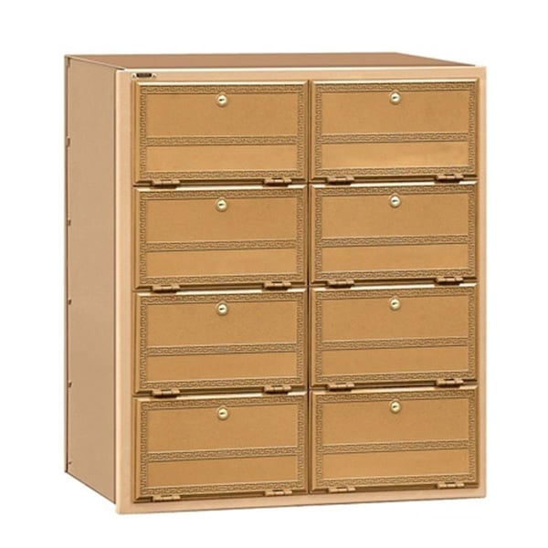Salsbury 2100 Series Americana Mailbox - 8 Doors - Rear Loading -Americana mailboxes for Private Access -Keyed versions can be accessed by the U.S.P.S. when installed in rotary mail centers. -Ideal for colleges schools private postal centers corporate mail centers military bases government agencies and many other applications -Units are 23.5 W x 26.5 H x 15 D in. -Available with 3 different door sizes: #1 3.5 W x 5 H #2 5.5 W x 6 H #3 11 W x 6 H in. -Available in 4 different configurations: 30 door unit #1 doors 16 door unit #2 doors 14 door unit 12 - #2 doors and 2 - #3 doors 8 door unit #3 doors -Compartments are constructed of 20 gauge steel and feature a powder coated tan finish -Compartments have open backs -Doors are aluminum die-cast with a powder coated brass finish -Doors include a 5 pin cylinder cam lock with 2 keys -Doors are hinged on aluminum frames -Door frame attaches to individual compartments with 4 screws -Designed to stack 2 high and mount adjacent to each other or between wall studs -Dimension - 23.5 W x 26.5 H x 15 D in. -Item Weight - 70 lbs. Options -Replacement doors -Custom engraved placards -Custom engraved doors -Trim kit -Thumb latches -Replacement locks -Additional keys -Key blanks