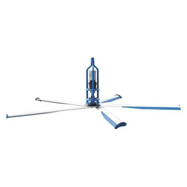 Ceiling Fan, 460V AC Voltage, 828 Fan Watts, Phase 3, 110 RPM, Max. Mounting Height 10 to 45 ft, Number of Speeds Variable, Blade Finish Aluminum, Housing Finish Steel, Powder Coated, Fan Blade Color Gray, Number of Blades 5, Speed Controllable - Fans Yes, 60 Hz, Reversible Yes, Includes Motor, Hub, Gearbox,(4) GuyWires, Vfd Control, Remote Control Keypad, Cat6 Cable (100 ft), Remote Lockable Disconnect