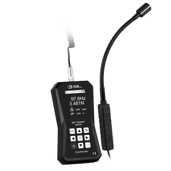 The belt tension meter is an optically measuring maintenance tool for determining the belt tension force. This belt tension meter consists of a display device and a sensor head attached on a semi-flexible gooseneck. The advantage of the gooseneck is that the sensor head can be flexibly positioned. Due to the mobility of the gooseneck, the sensor can measure the strand force even in hard to reach places. The belt tension measuring device measures the belt tension in Newton and the belt frequency in Hz of the belt in the stationary state.A small impulse on the belt is sufficient to set the belt vibrating. The belt tension meter measures with the sensor the natural frequency of the belt generated in this way and visualizes it on the display. The belt tension meter can directly determine the actual tension in Newton / Pound Force of the belt from the belt frequency combined with the optionally entered belt length and belt mass. However, entering this data is not necessarily required in order to carry out the measurements directly with the belt tension measuring device. The measurement units in the device can be switched between N SI unit and pound force US unit.The reading is always shown as the belt frequency in Hz on the display of the belt tension measuring device. The intuitive graphic menu is visualized on the high-contrast display of the belt tension measuring device in six different languages. Up to 750 data records can be stored in the memory of the belt tension measuring device. The belt tension measuring device is delivered completely ready for use. The scope of delivery includes the handheld device, the standard sensor with gooseneck, a magnetic holder, batteries and operating manual. To increase the flexibility during the measurement, the following items are optionally available to the belt tension meter: an external sensor head with a spiral cable, a device hard case, a frequency mallet and a tripod.HIGHLIGHTS- Measurement of the oscillation frequency of the drive belt- Intuitive controls- Calculation of the tension force- Display of the belt tension in N- 6 menu languages- Memory for 750 measured values- Sensor on gooseneck- Input of belt length and belt mass
