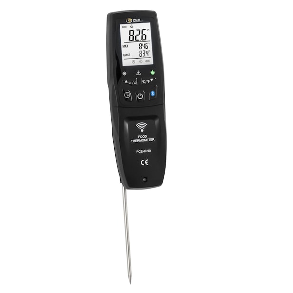 The thermometer is used to check the temperature of food. In addition to the surface temperature via the infrared sensor, the thermometer can also be used to determine the core temperature via the fold-out resistance temperature sensor. Both temperature sensors on the thermometer have a measuring range of -40 ... 300°C / -40 ... 572°F.In addition to the normal measured value display, the thermometer has a temperature display. This display on the thermometer signals whether the temperature of the food being measured is optimal. If the temperature is between 4 65°C / 39.2 ... 149°F, this is indicated by a red LED. If the temperature is colder than 4°C / 39.2°F or warmer than 65°C / 149°F, this is indicated by a green LED. This function in the thermometer is particularly important in order to monitor the respective temperature chain. Therefore, the thermometer is used especially in the food industry.The Bluetooth interface enables communication between the thermometer and a mobile Android and iOS device. With the free app for the thermometer, the measured values can be recorded with a mobile device and exported for later analysis. To charge the measuring device, the thermometer can be plugged into the charging station provided. If necessary, the thermometer can also be charged via a 5 V micro USB interface.HIGHLIGHTS- Measuring range -40 ... 300°C / -40 ... 572°F- Infrared and penetration temperature sensor- Timer and stopwatch function- Charging station with micro USB cable- Bluetooth interface- Mobile temperature measuring device- Easy handling