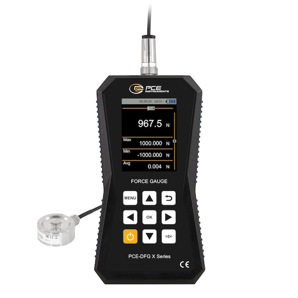 The Force Gauge / Digital Force Gauge with an external pressure load cell is designed for measuring compressive forces at measuring locations that are difficult to access. The Force Gauge / Digital Force Gauge or rather the pressure load cell has several threaded holes at the bottom that allow it to be mounted securely. The load cell is connected to the Force Gauge / Digital Force Gauge via an approx. 3 m / 9.8 ft long sensor cable and, thanks to the compact cell dimensions, it can be used for a wide range of applications. The internal memory of 32 GB can hold 30 million measuring points. This allows measurement protocols to be created, saved and exported. The Force Gauge / Digital Force Gauge has a USB-C interface that can be used to import the measurement data into the PC software. The device is equipped with a graphic LCD that displays the measured values both numerically and graphically. In addition, a bar chart shows the measured value within the selected measurement range. The measuring cell is IP67 protected and can therefore also be used in rough industrial environments.