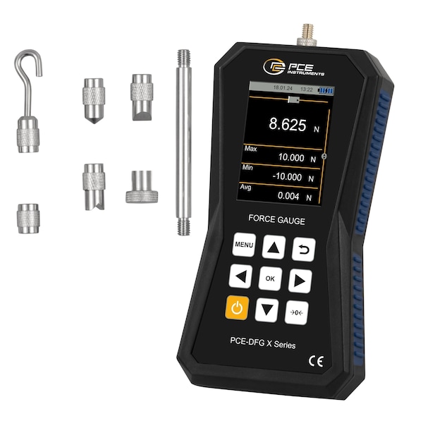 Both tensile and compressive forces can be measured with high accuracy using this Tension Dynamometer / Tension Load Cell. Tensile and compressive forces are frequently measured in test laboratories. For example, to determine the yield point, the tear-off force or the force required to actuate buttons or switches. The Tension Dynamometer / Tension Load Cell has an internal measuring cell and can measure forces up to 10 N / 2.2 lbf. Various eyelets or hooks with an M6 thread can be attached to the measuring cells. It is also possible to attach your own devices to the measuring cell using these threads. The internal memory of 32 GB offers space for 30 million measuring points. This can be used to create, save and export measurement logs. The Tension Dynamometer / Tension Load Cell has a USB-C interface that can be used to read the measurement data into the PC software. The Tension Dynamometer / Tension Load Cell is equipped with a graphic LCD that displays the measured values both numerically and graphically. In addition, a bar chart shows the measured value within the selected measurement range. Various force test stands are available for adapting the Tension Dynamometer / Tension Load Cell.