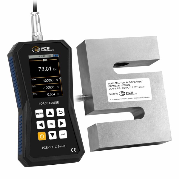 The Force Gauge / Digital Force Gauge can be used to measure both tensile and compressive forces with high accuracy. Tensile and compressive forces are often measured in the test laboratory. For example, to determine the yield point, the tear-off force or the force required to actuate buttons or switches. The Force Gauge / Digital Force Gauge is supplied with an external measuring cell and can measure forces of up to 100 kN / 100,000 N / 22,480.9 lbf. Various eyelets or hooks with an M33 thread can be attached to the measuring cells. It is also possible to attach your own devices to the measuring cell using these threads. The internal memory of 32 GB offers space for 30 million measuring points. This allows measurement logs to be created, saved and exported. The Force Gauge / Digital Force Gauge has a USB-C interface that can be used to read the measurement data into the PC software. The Force Gauge / Digital Force Gauge is equipped with a graphic LCD that displays the measured values both numerically and graphically. In addition, a bar chart shows the measured value in the selected measuring range. The measuring cell is protected to IP67 and can therefore also be used in harsh industrial environments. Various force test stands are available for adapting the Force Gauge / Digital Force Gauge. A special feature of the Force Gauge / Digital Force Gauge is the possibility to exchange the measuring cell between the models. By entering the sensitivity in mV/V, all measuring cells can be used with just one handheld device.