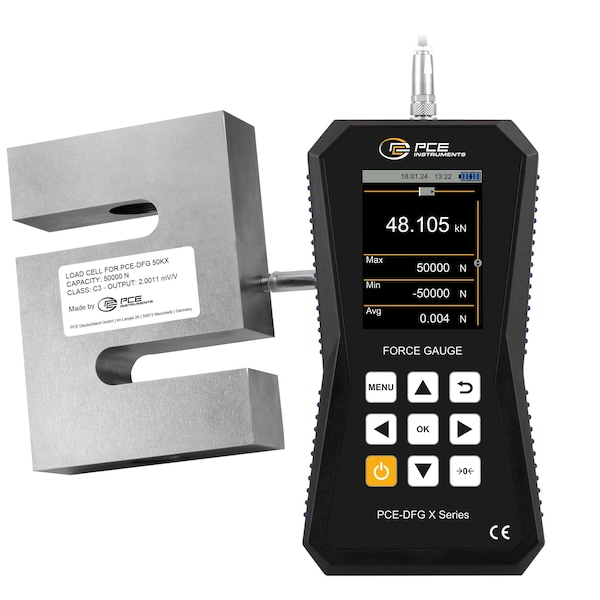 The Force Gauge / Digital Force Gauge can be used to measure both tensile and compressive forces with high accuracy. Tensile and compressive forces are often measured in the test laboratory. For example, to determine the yield point, the tear-off force or the force required to actuate buttons or switches. The Force Gauge / Digital Force Gauge is supplied with an external measuring cell and can measure forces of up to 50 kN / 50,000 N / 11,240.4 lbf. Various eyelets or hooks with an M20 thread can be attached to the measuring cells. It is also possible to attach your own devices to the measuring cell using these threads. The internal memory of 32 GB offers space for 30 million measuring points. This allows measurement logs to be created, saved and exported. The Force Gauge / Digital Force Gauge has a USB-C interface that can be used to read the measurement data into the PC software. The Force Gauge / Digital Force Gauge is equipped with a graphic LCD that displays the measured values both numerically and graphically. In addition, a bar chart shows the measured value in the selected measuring range. The measuring cell is protected to IP67 and can therefore also be used in harsh industrial environments. Various force test stands are available for adapting the Force Gauge / Digital Force Gauge. A special feature of the Force Gauge / Digital Force Gauge is the possibility to exchange the measuring cell between the models. By entering the sensitivity in mV/V, all measuring cells can be used with just one handheld device.
