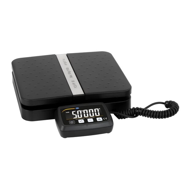 The parcel scale is a very precise measuring device for determining weights due to the resolution of 1 g and an accuracy of +/- .1% of measuring range. The display units available on the parcel scale are lb / oz, kg / g, kg, g, lb, oz. The illuminated LC display of the parcel scale is sized in such a way that the measured value can be read easily even in very bright ambient conditions. In addition, the display of the parcel scale can be removed and can be positioned freely because of the spiral cable. With the piece counting function, the parcel scale can determine the number of objects, such as screws. For this purpose, a reference measurement is first carried out on the parcel scale. The piece counting function is then started by pressing a button. As an extension of the piece counting function, the weighing surface of the parcel scale can be opened to the side. In this way, for example, stacked envelopes or similar can be weighed with the parcel scale without them falling off the weighing surface. The parcel scale is supplied with power via a 6 V DC mains power adapter. In addition, the parcel scale can be operated with three 1.5 V batteries. This means that the parcel scale can be used both stationary and mobile. The automatic switch-off ensures that the parcel scale switches itself off within 5 minutes of inactivity. PCE Instruments optionally offers an ISO calibration certificate for the parcel scale.