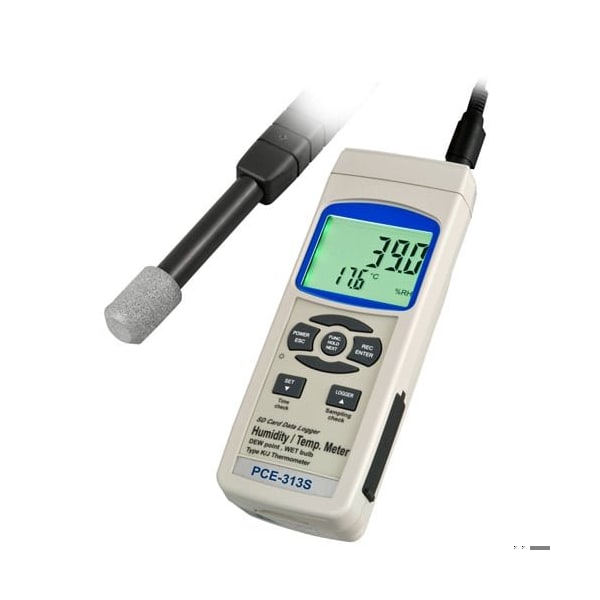 The Climate Meter has been designed for professional use in fields such as the air-conditioning sector. The Climate Meter determines both relative humidity and ambient temperature. The Climate Meter can be connected to type K thermo-elements to detect, for instance, the temperature of a wall by means of a surface probe. The internal memory of the Climate Meter allows you to record humidity and temperature values, with a free adjustment of the measurement rate for real time measurements or data storage thanks to its SD memory card 1 to 16 GB. The Climate Meter can be previously programmed via the keypad so the device can record values without the need of being present during the process. For long term records, we recommend you to power the Climate Meter by means of a power adapter optional. Recorded values can be transferred to a PC for further analysis .xls file in the SD card. This property allows you to check measured values or design a graphic by means of the Excel calculation program.